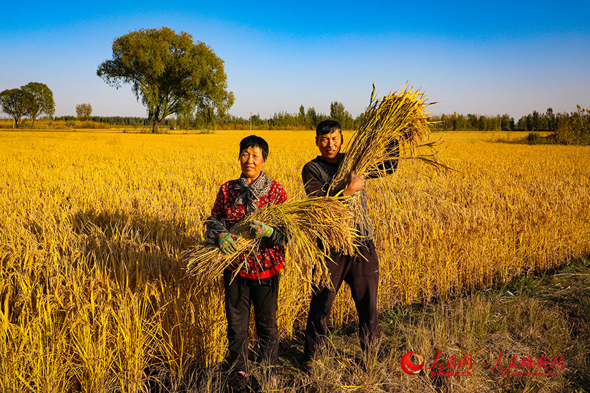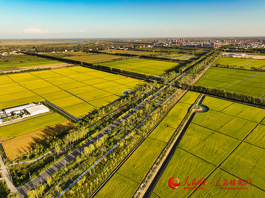 在安新,金燦燦的田野上,稻浪滾滾,一派喜人的豐收景象。
