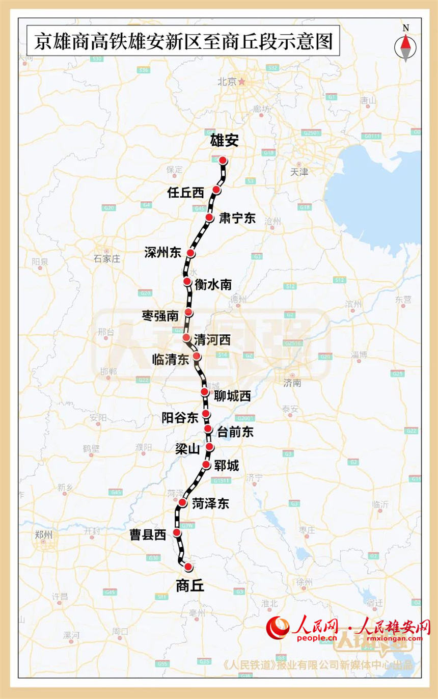 此次開工建設的京雄商高鐵雄安新區至商丘段,設計時速350公里、正線全長552公里,建設工期4年。線路北起京雄城際鐵路雄安站,經河北省雄安新區、滄州市、衡水市、邢臺市,山東省聊城市,河南省濮陽市,山東省濟寧市、菏澤市至河南省商丘市,終至商合杭高鐵商丘站。全線設雄安、任丘西、肅寧東、深州東、衡水南、棗強南、清河西、臨清東、聊城西、陽谷東、臺前東、梁山、鄆城、菏澤東、曹縣西、商丘16座車站,其中雄安和菏澤東2座車站為既有車站,梁山、鄆城、商丘3座車站為改擴建車站,衡水南等11座車站為新建車站。京雄商高鐵雄安新區至商丘段全線橋梁占比約94%,其中位于河南省濮陽市臺前縣的黃河特大橋是全線控制性工程。
