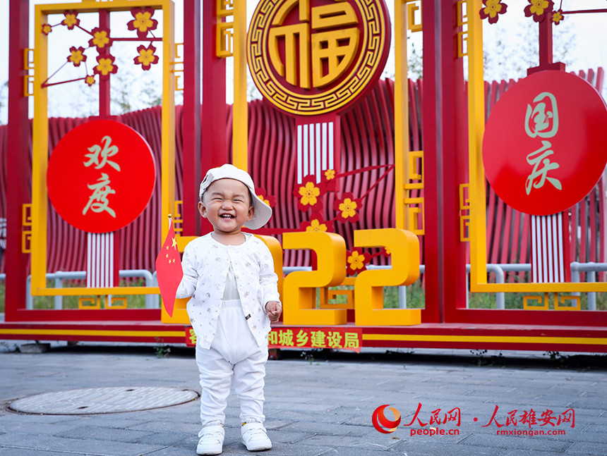 小朋友在雄安容城漫生活廣場開心地揮動國旗。人民網 宋燁文攝