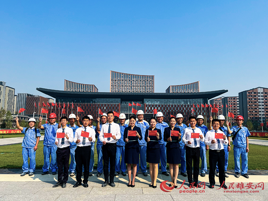 雄安商務服務中心前,建設者們揮動國旗。人民網 楊華龍攝