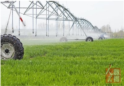 海河流域各地全面提高水資源集約利用效率,努力實現增產增效不增水。圖為海河流域子牙河系滏陽河流經的河北省邯鄲市雞澤縣,一臺平行行走式水肥藥一體機正在農田里進行澆水作業,每畝地可節水30%到50%。金書懷攝(影像中國)