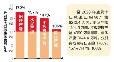 超額完成“十三五”六大行業去產能任務,至2020年底累計壓減退出鋼鐵產能8212.4萬噸、水泥產能1194.9萬噸、平板玻璃產能4999萬重量箱、焦化產能3144.4萬噸,分別完成目標任務的170%、157%、147%、106%,鋼鐵產能由峰值時的3.2億噸減到2億噸以內。