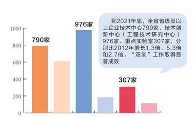 到2021年底,全省省級及以上企業技術中心790家、技術創新中心(工程技術研究中心)976家、重點實驗室307家,分別比2012年增長1.3倍、5.3倍和2.7倍?!半p創”工作取得顯著成效。到2021年底,全省孵化器數量達184家,其中,國家級43家;眾創空間332家,其中國家級106家。