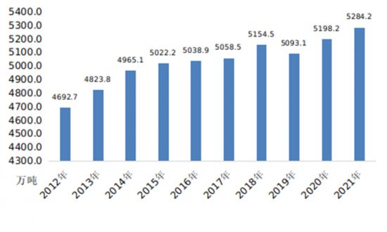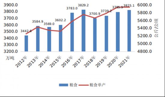 糧食綜合生產能力在前期連續多年增產、起點較高的情況下,再上新臺階。2021年,全省糧食產量達到3825.1萬噸,居全國第7位,比2012年增長11.1%,年均增長1.2%。隨著農業生產條件改善、農業科技水平的提高、優良品種大規模推廣應用,全省糧食單產逐年提高,單產由2012年的5253公斤/公頃提高到2021年的5950公斤/公頃,增長13.3%。