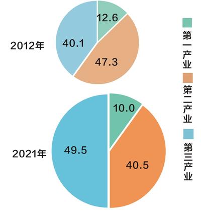 著力化解過剩產能,大力推進產業結構調整,加快推進服務業發展,全省三次產業結構發生了歷史性轉變。三次產業比例由2012年的12.6:47.3∶40.1優化為2021年的10.0∶40.5∶49.5,第三產業成為拉動經濟增長主動力。其中,2015年,第三產業比重超過第二產業,躍升為國民經濟第一大產業,全省產業結構首次呈現“三二一”格局;2018年,第三產業比重首次達到50%,2019年、2020年第三產業比重持續超過“半壁江山”,“三二一”格局更加穩固。主導產業發展壯大。2021年,全省12大主導產業增加值突破兩萬億元,達到21667.9億元,占GDP比重為53.7%,在促進經濟社會發展、優化產業布局中發揮重要作用。
