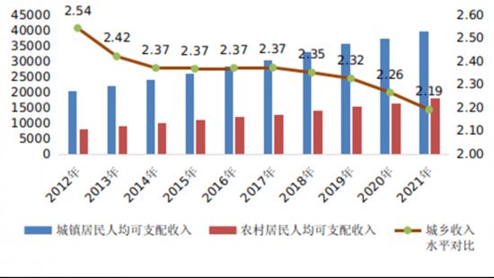 黨的十八大以來,城鄉居民收入快速增長,尤其是農村居民收入不斷提高,城鄉收入差距逐步縮小。2021年農村居民人均可支配收入18179元,是2012年的2.2倍,年均增長9.4%;2021年城鎮居民人均可支配收入39791元,比2012年增長93.7%,年均增長7.6%。城鄉收入比逐年縮小,由2012年的2.54縮小到2021年的2.19,下降0.35。