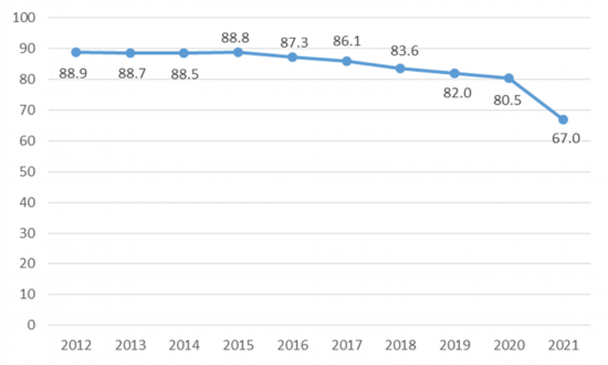 2021年全省學前教育三年毛入園率達89.44%,比2012年提高21.44個百分點。普惠性幼兒園快速發展。2021年,普惠性幼兒園占全部幼兒園比重達76.7%,普惠性幼兒園幼兒占比達87.4%。