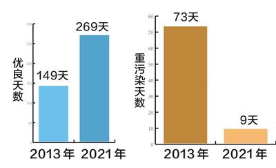 從2013年到2021年,全省PM2.5平均濃度從104微克/立方米下降到了38.8微克/立方米,優良天數由149天增加到了269天,重污染天數由73天減少到了9天。