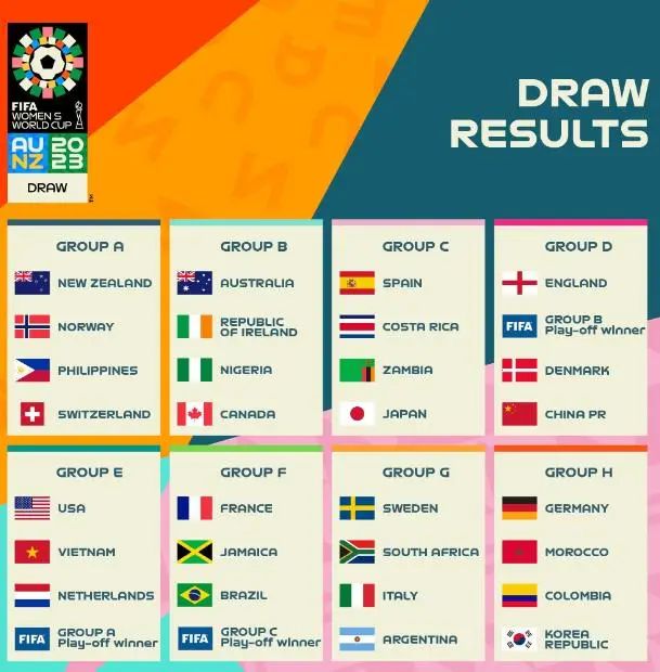 4、2023女足世界杯,中國隊最終分在D組,與2022年歐錦賽新科冠軍英格蘭隊、歐洲勁旅丹麥隊同在一組。