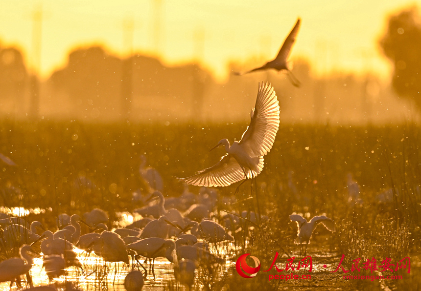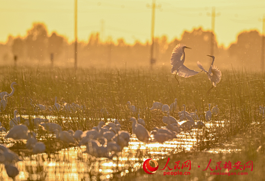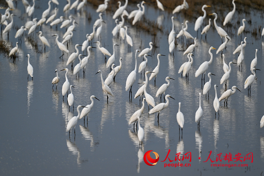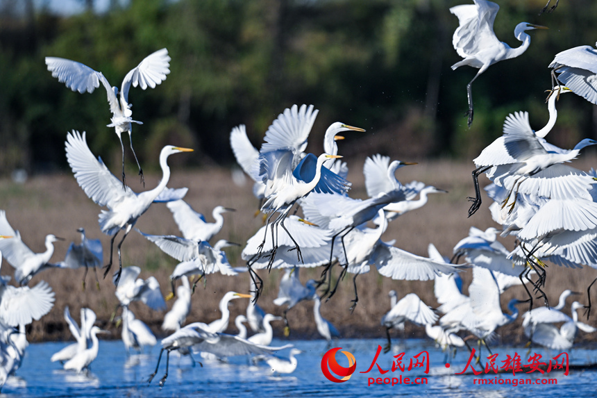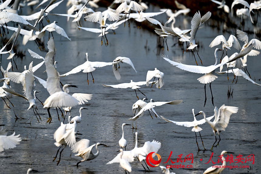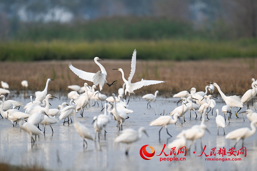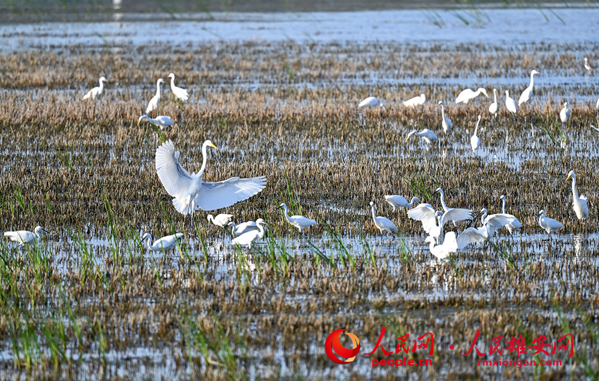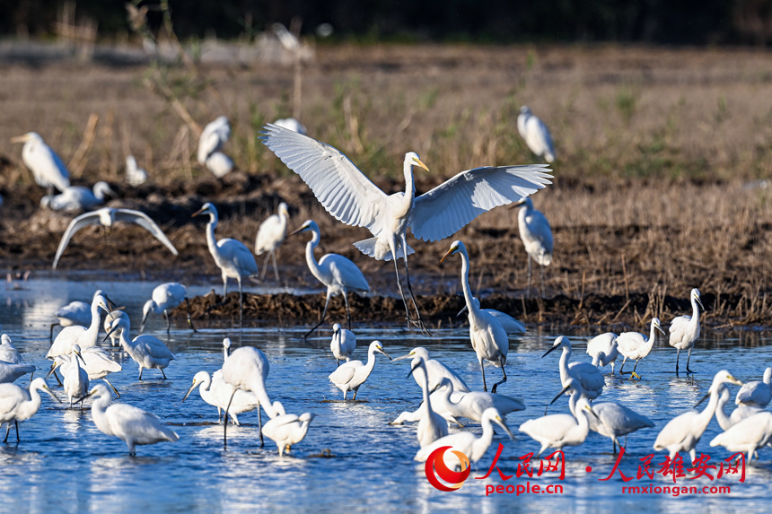 人民網雄安10月25日 (劉師豪、宋燁文)雄安新區安新縣的愛鳥護鳥志愿者在一處淺塘濕地內拍攝到了眾多鷺科白鷺屬鳥類,包括大白鷺、中白鷺、小白鷺等,它們體羽全白,均為國家“三有”(國家保護的有益的或者有重要經濟、科學研究價值的)野生動物。這些鳥兒時而展翅翱翔,時而落在水中捕食、休憩,十分自在。
