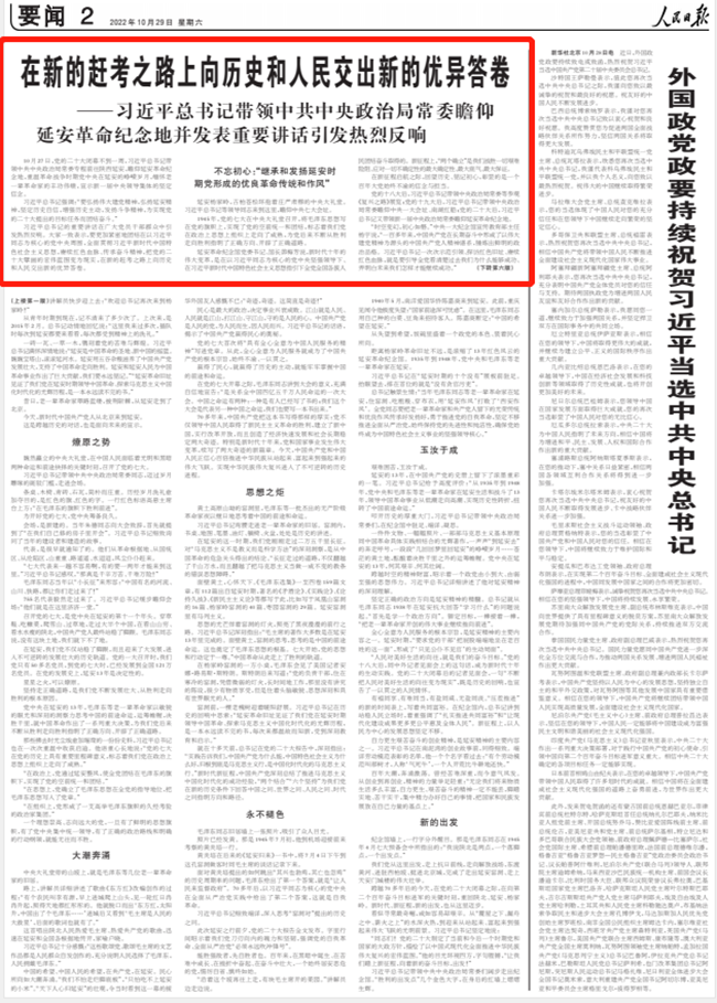 10月27日,黨的二十大閉幕不到一周,習近平總書記帶領中共中央政治局常委專程前往陜西延安,瞻仰延安革命紀念地,重溫革命戰爭時期黨中央在延安的崢嶸歲月,緬懷老一輩革命家的豐功偉績,宣示新一屆中央領導集體的堅定信念。