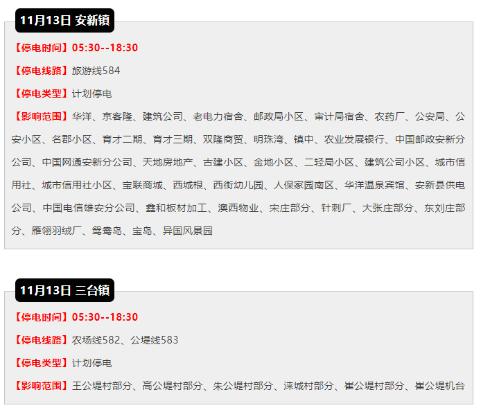 2、停電提醒:今明兩天,安新縣安新鎮、大王鎮、三臺鎮多地計劃停電。
