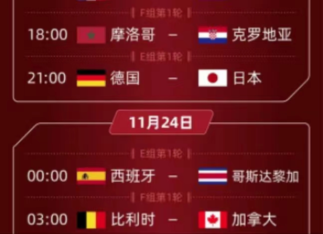 卡塔爾世界杯今日18:00將迎來F組第1輪摩洛哥對陣克羅地亞的比賽,21:00將迎來E組第1輪德國對陣日本的比賽;23日00:00將迎來E組第1輪西班牙對陣哥斯達黎加,03:00將迎來F組第1輪比利時對陣加拿大的比賽。