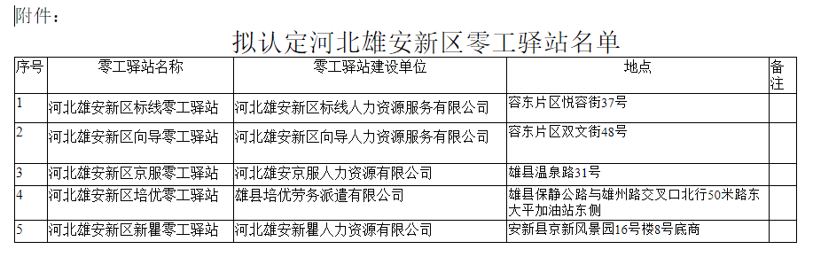 人民網雄安11月23日電 (何美萱)據雄安新區公共服務局發布的《關于河北雄安新區零工驛站認定結果的公示》,經過實地考察、資料查閱與專家評審,河北雄安標線人力資源服務有限公司等5家單位擬被認定為河北雄安新區零工驛站,現正在公示。