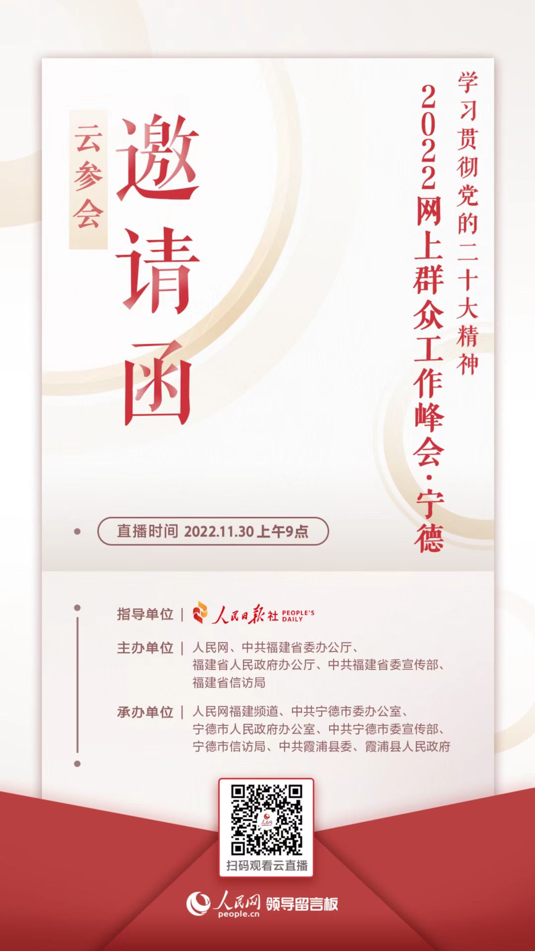 為深入學習貫徹黨的二十大精神,由人民日報社指導,人民網、中共福建省委辦公廳、福建省人民政府辦公廳、中共福建省委宣傳部、福建省信訪局主辦的2022網上群眾工作峰會將于11月30日在福建省寧德市舉行。
