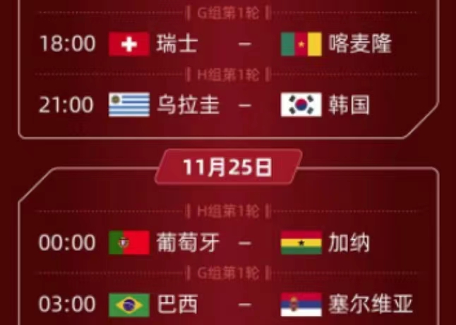 卡塔爾世界杯今日18:00將迎來G組第1輪瑞士對陣喀麥隆的比賽,21:00將迎來H組第1輪烏拉圭對陣韓國的比賽;25日00:00將迎來H組第1輪葡萄牙對陣加納,03:00將迎來G組第1輪巴西對陣塞爾維亞的比賽。