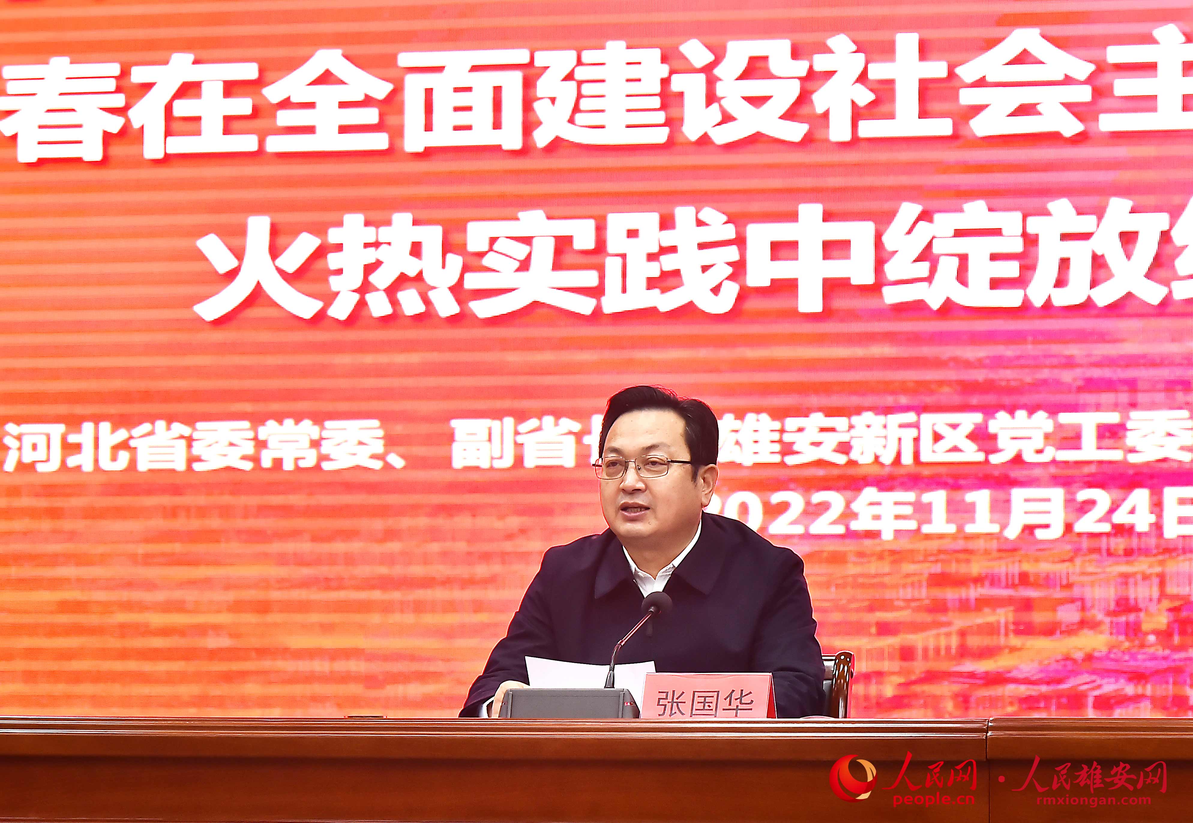 人民網雄安11月25日電 按照河北省委統一部署,11月24日,河北省委宣講團成員,河北省委常委、副省長,雄安新區黨工委書記、管委會主任張國華到河北金融學院向師生宣講黨的二十大精神。他強調,要深入學習宣傳貫徹黨的二十大精神,用新時代黨的創新理論武裝師生、用社會主義核心價值觀塑造師生、用黨和國家的輝煌成就激勵師生,引導教育廣大師生堅定不移聽黨話、跟黨走,深刻認識“兩個確立”的決定性意義,自覺做“兩個維護”的忠誠踐行者,在全面建設社會主義現代化國家、全面推進中華民族偉大復興的新征程中展現擔當、放飛夢想。