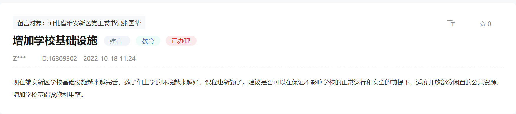 人民網雄安11月25日電 (劉師豪)有網友日前在人民網“領導留言板”留言,希望能夠在不影響學校正常運行和安全的前提下,適度開放校內部分閑置公共資源,增加學?;A設施利用率。