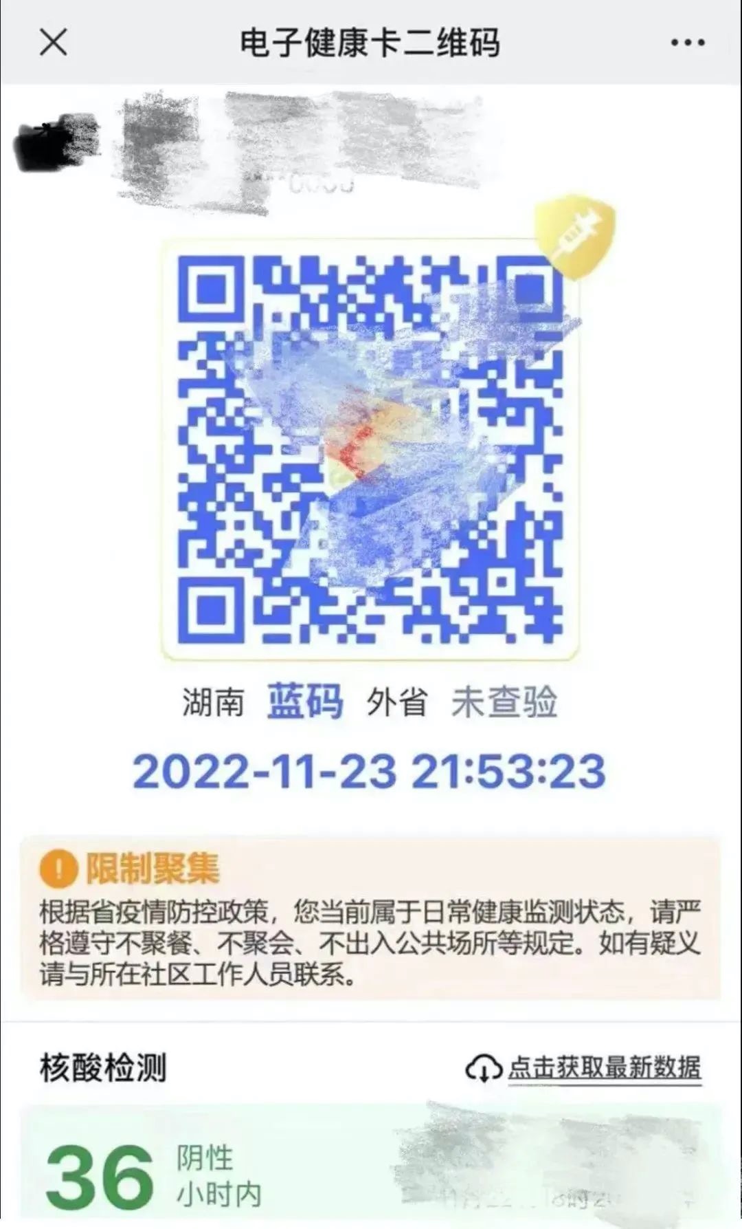 3、外省入(返)湖南人員自抵湘之日起5天內,“湖南省居民健康碼”會賦藍碼(紅黃碼除外),并彈窗提示“入(返)湘人員未滿5天”。藍碼人員正常工作、看病就醫、孩子上學、乘坐公共交通工具等不受影響,各地不得加以限制。