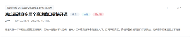 該網友稱,容東片區一年來已回遷三批居民,但對外出行不太方便。容東片區有2個京雄高速的出入口,目測早已完工,請領導督促相關部門盡快開放。