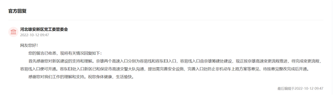 針對網友留言,雄安新區黨工委管委會回復稱,京雄高速的2個入口分別為容易線和容東片區E3路(金湖街)入口。其中,容易線出入口由京雄籌建處建設,現正按京雄高速變更流程推進,待完成變更流程,容易線入口便可開通。關于容東片區E3路入口,雄安新區有關部門已和保定市高速交警大隊溝通,提出需完善安全設施、完善入口處防止非機動車上路方案等意見,待按意見整改完成后開通。