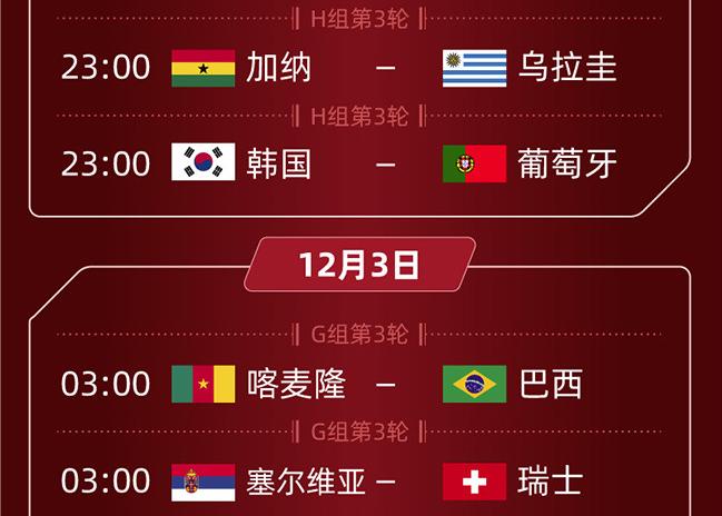 卡塔爾世界杯今日23:00將迎來H組第3輪加納對陣烏拉圭、韓國對陣葡萄牙的比賽;12月3日03:00將迎來G組第3輪喀麥隆對陣巴西、塞爾維亞對陣瑞士的比賽。