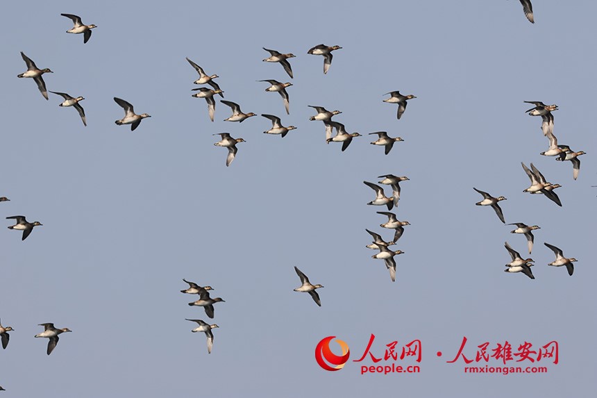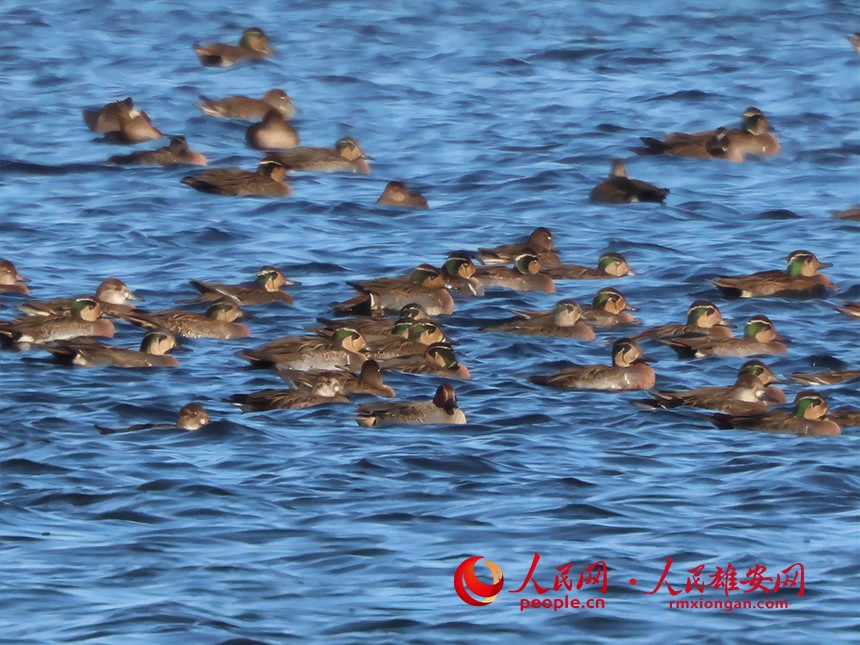 人民網雄安12月2日電 在雄安新區雄縣近日組織開展的野生鳥類監測活動中,愛鳥護鳥志愿者在白洋淀監測到數百只國家二級重點保護野生動物花臉鴨集群活動的影像。