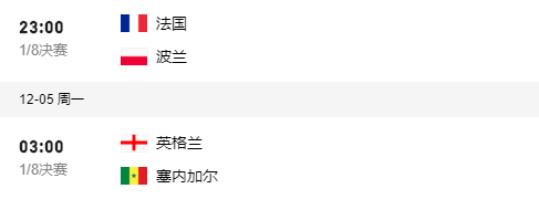 卡塔爾世界杯今日23:00將迎來1/8決賽法國對陣波蘭的比賽;12月5日03:00將迎來1/8決賽英格蘭對陣塞內加爾的比賽。