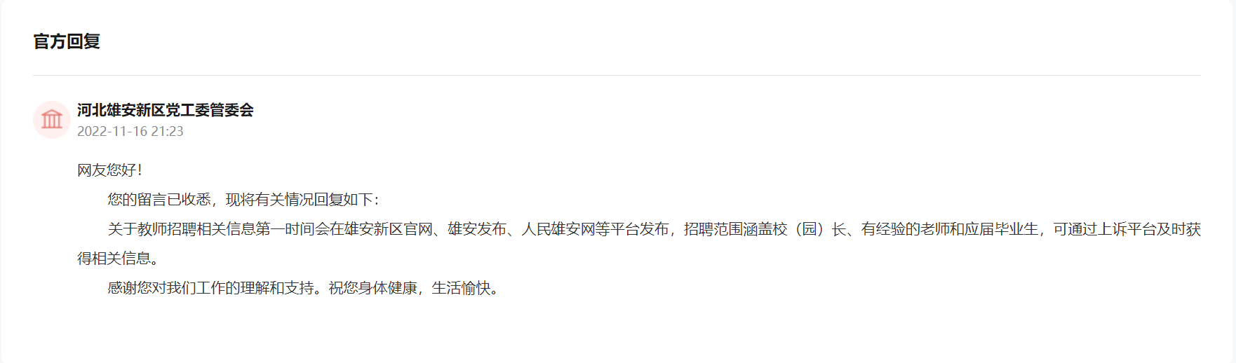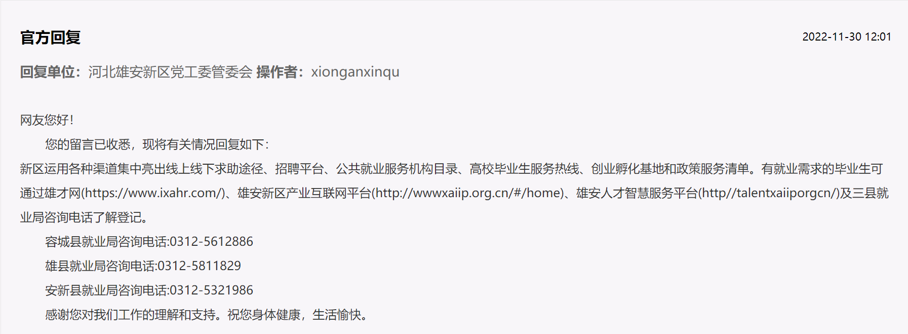 4、近期,有多位網友在人民網“領導留言板”留言,稱愿意來雄安新區干事創業,想了解新區相關政策、舉措。對于這些留言,雄安新區黨工委管委會作出回復。