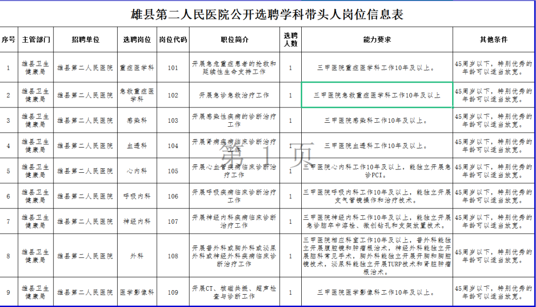 附件:《雄縣第二人民醫院公開選聘學科帶頭人崗位信息表》