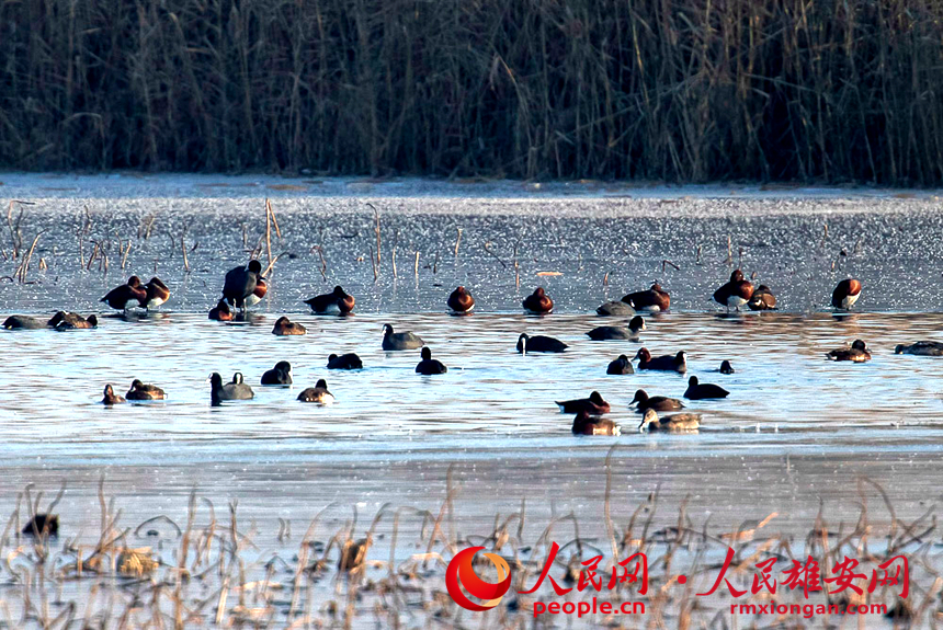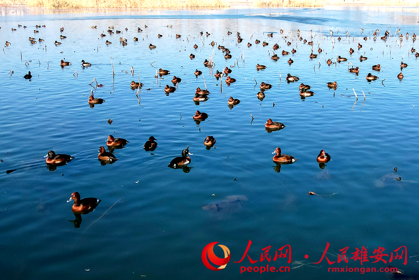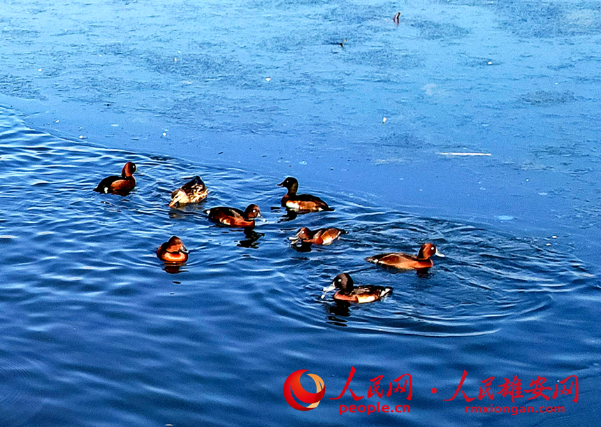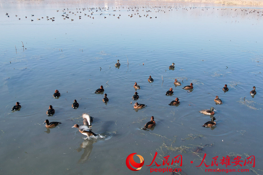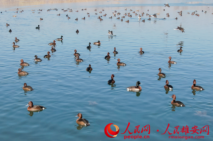 人民網雄安12月8日電 (劉師豪)來自雄安新區安新縣的愛鳥護鳥志愿者,近日在白洋淀一處未結冰的水域內拍攝到了一大群青頭潛鴨、白眼潛鴨、骨頂雞等鳥類,它們時而潛入水中覓食,時而揮動翅膀躍出水面,十分悠閑。據志愿者稱,保守估計,此次發現的青頭潛鴨數量在90只以上,是白洋淀有青頭潛鴨記錄以來數量最多的一次。