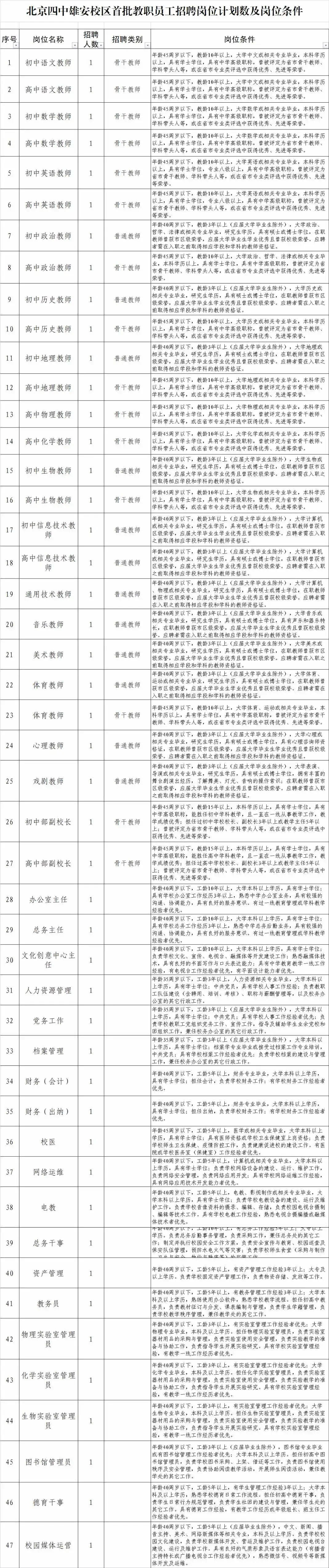 北京市援建雄安新區交鑰匙項目三所學校(簡稱“三?!保┦怯杀本┦姓顿Y建設,建成后移交雄安新區,并分別委托北京市北海幼兒園、北京市東城區史家胡同小學、北京市第四中學管理的高品質學校。為促進雄安新區基礎教育高質量發展,北京市援建雄安新區交鑰匙項目中學公開招聘教職工47名,有關事項公告如下: