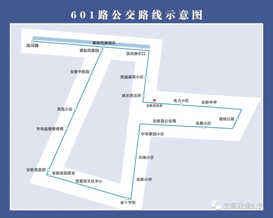601路為環線,包括濱河路、景新風景園、安新縣中醫院、西苑小區、市場監督管理局、安新縣醫院、安新縣醫院東、西里街文化中心、老十字街、安新小學、天地小區、中華家園小區、安新縣公安局、名郡小區、濕地公園、安新中學、電力小區、城關派出所、凱盛嘉苑小區、濱河路東口、景新風景園東等21站。(雨污分流施工期間,暫時取消市場監督管理局、安新縣醫院、安新縣醫院東、西里街文化中心、老十字街、安新小學、天地小區、中華家園站。)