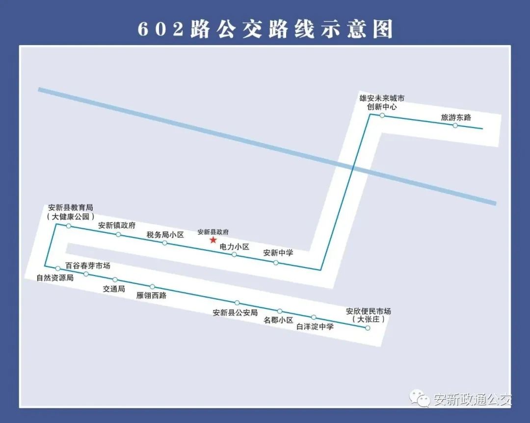 602路為旅游東路、雄安未來城市創新中心、安新中學、電力小區、稅務局小區。安新鎮政府、安新縣教育局(大健康公園)、自然資源局、百谷春芽市場、交通局、雁翎西路、安新縣公安局、名郡小區、白洋淀中學、安欣便民市場(大張莊)等15站。