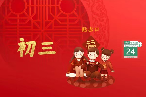 今天是2023年1月24日,星期二,天氣晴 ,-17℃~-5℃。今天是正月初三,按習俗,在這天要選一張約長七八寸、寬一寸的紅紙條寫上吉祥話貼在門前的門頂上以求招財進寶,萬事如意。