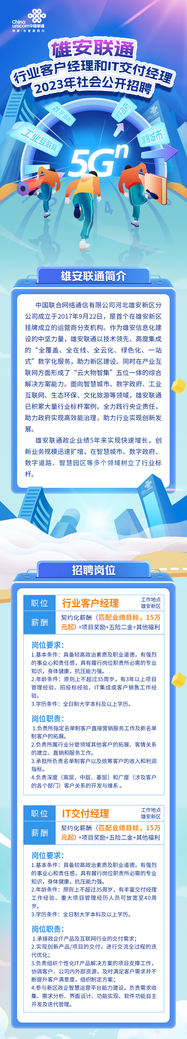 人民網雄安2月2日電 (何美萱)中國聯合網絡通信有限公司河北雄安新區分公司(以下簡稱“雄安聯通”)現面向社會公開招聘行業客戶經理、IT交付經理。