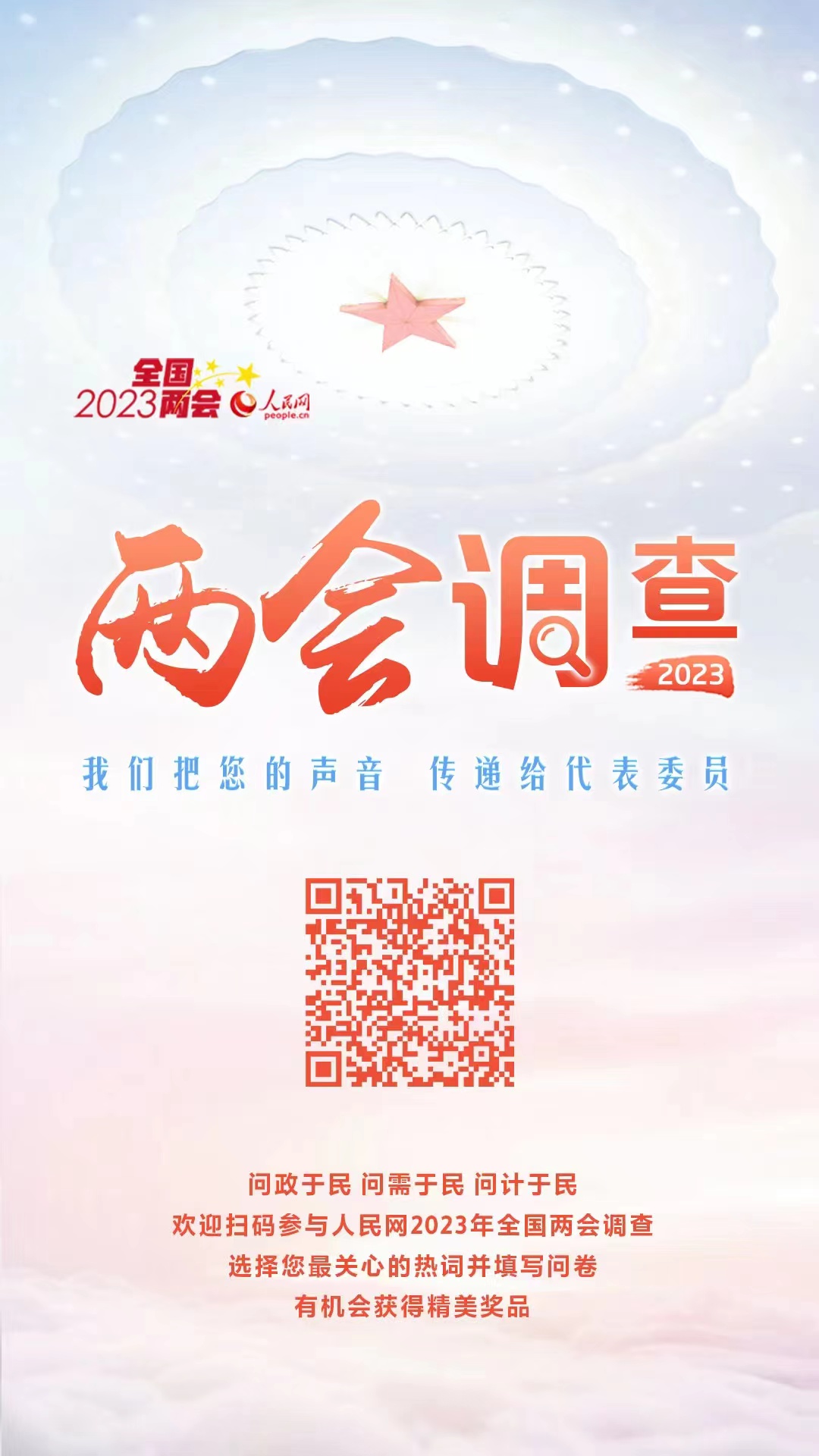 2、人民網2023年全國兩會調查于正式上線,這是人民網連續22年開展全國兩會調查。網友可通過人民網2023年全國兩會調查專題、“人民網+”客戶端、人民網法人微博等全媒體通道進入調查頁面,選擇您最關心的熱詞并填寫調查問卷。