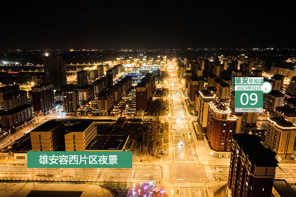 今天是2023年2月9日,星期四,小雪轉多云 ,-7~1℃。在封面和大家見面的是雄安容西片區夜景。