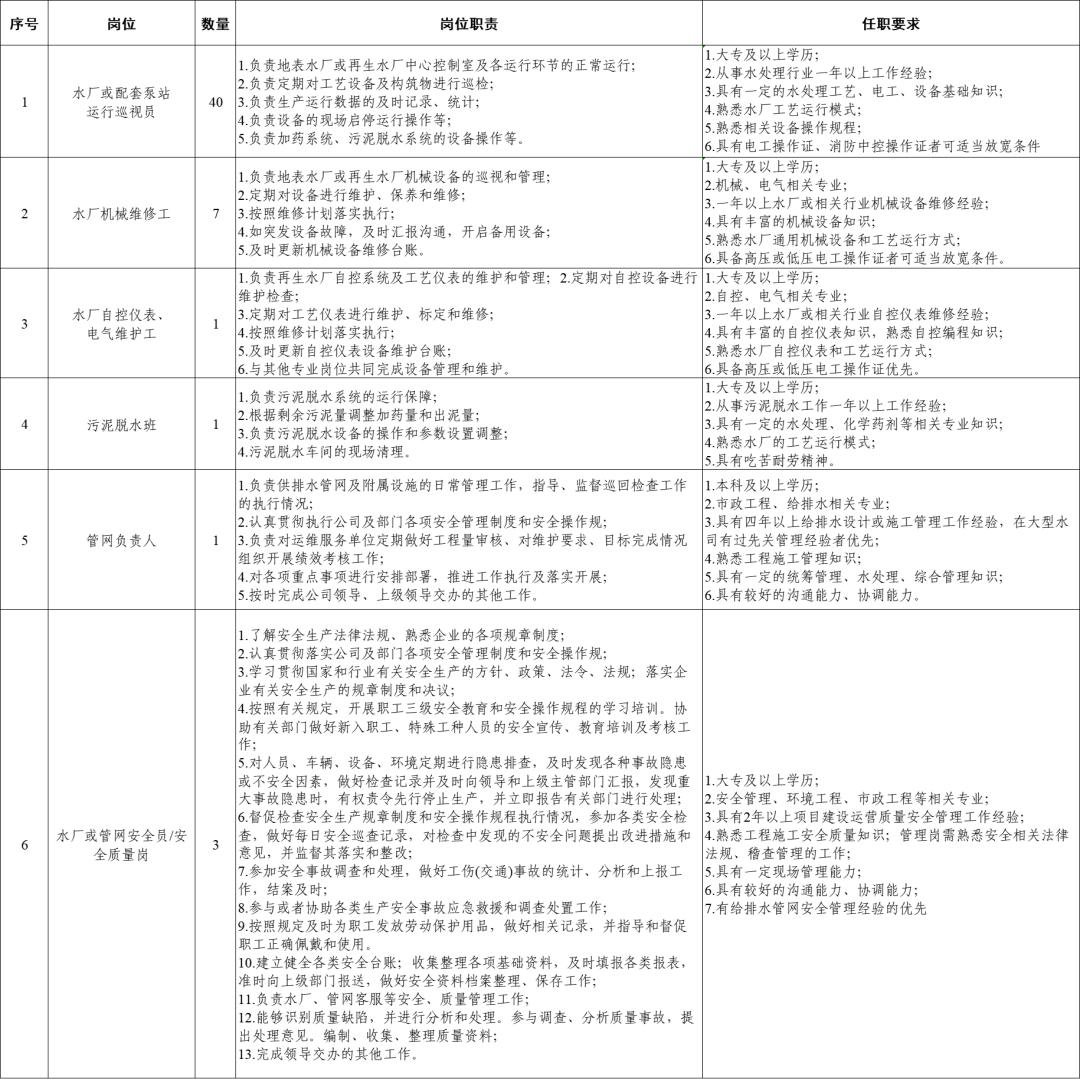 以下崗位入職人員將根據實際工作需要,安排至容東、容西、雄東、昝崗等片區水務運營項目工作。