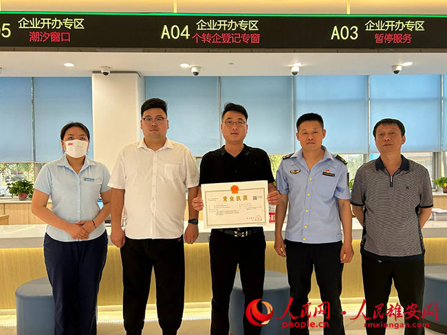 人民網雄安5月26日電 (王紅)“由個體工商戶升級為企業,做大做強的底氣更足了?!比涨?,在雄安新區容城縣政務服務中心,個體工商戶沈濤在專窗工作人員的幫助下辦理了“個轉企”轉型升級業務,并于當天拿到了新的營業執照,成為雄安新區首張“個轉企”營業執照申領者。