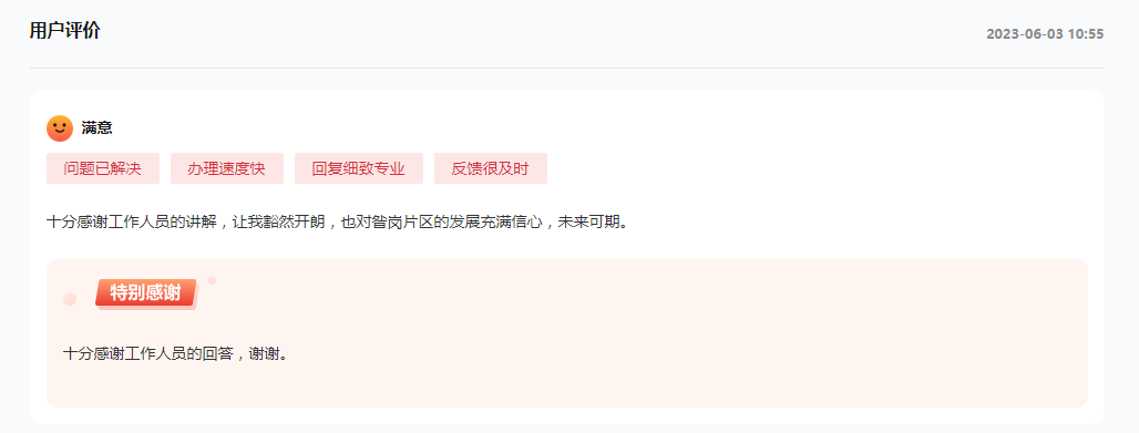 “工作人員的講解讓我豁然開朗,也對昝崗片區的發展充滿信心,感覺未來可期?!本W友對該回復表示滿意,并對工作人員的回答作出感謝。