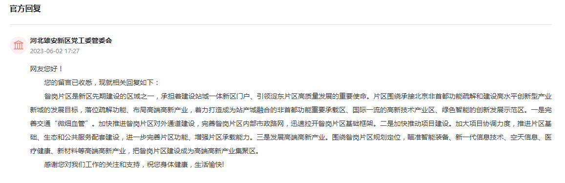 有回音|網友留言詢問雄安新區昝崗片區發展規劃 官方詳實回復獲點贊