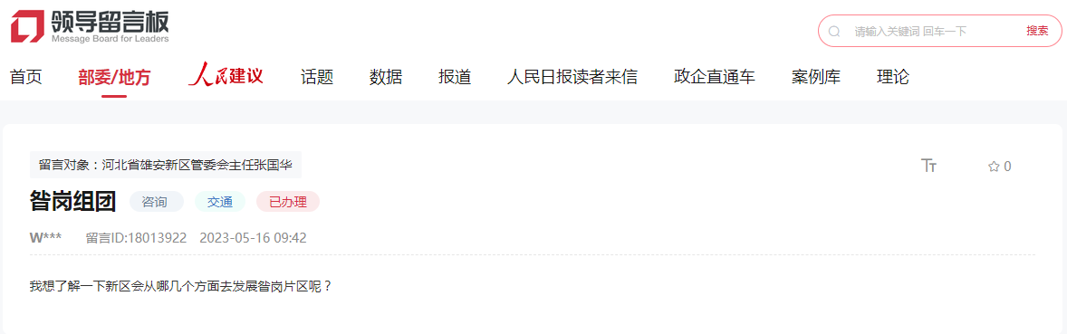 人民網雄安6月6日電 (王紅、劉師豪)“我想了解一下,雄安新區會從哪幾個方面去發展昝崗片區呢?”近日,有網友在人民網“領導留言板”留言,提出了這個問題。