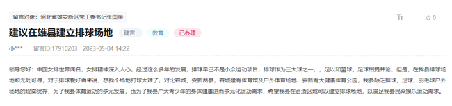 人民網雄安6月21日電 (記者李雪晴)“對比容城、安新兩縣,容城建有體育館及戶外體育場地,安新有大健康體育公園,我縣缺乏排球、足球、羽毛球戶外場地,希望在合適區域可以建立排球場地,以滿足群眾娛樂運動需求?!苯?,有雄安新區雄縣網友在人民網“領導留言板”反映“雄縣缺乏排球、足球、羽毛球戶外場地”,希望在合適區域可以建立排球場地。