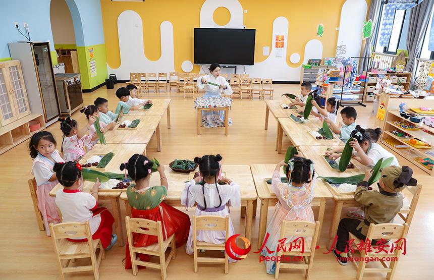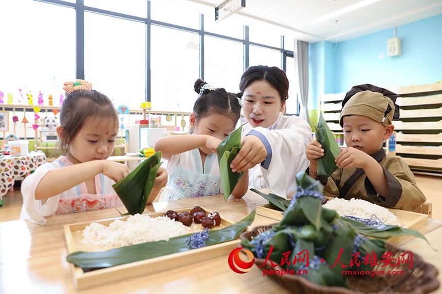 雄安容西青禾幼兒園開展端午游園會活動,孩子們正在學習包粽子。人民網 李兆民攝