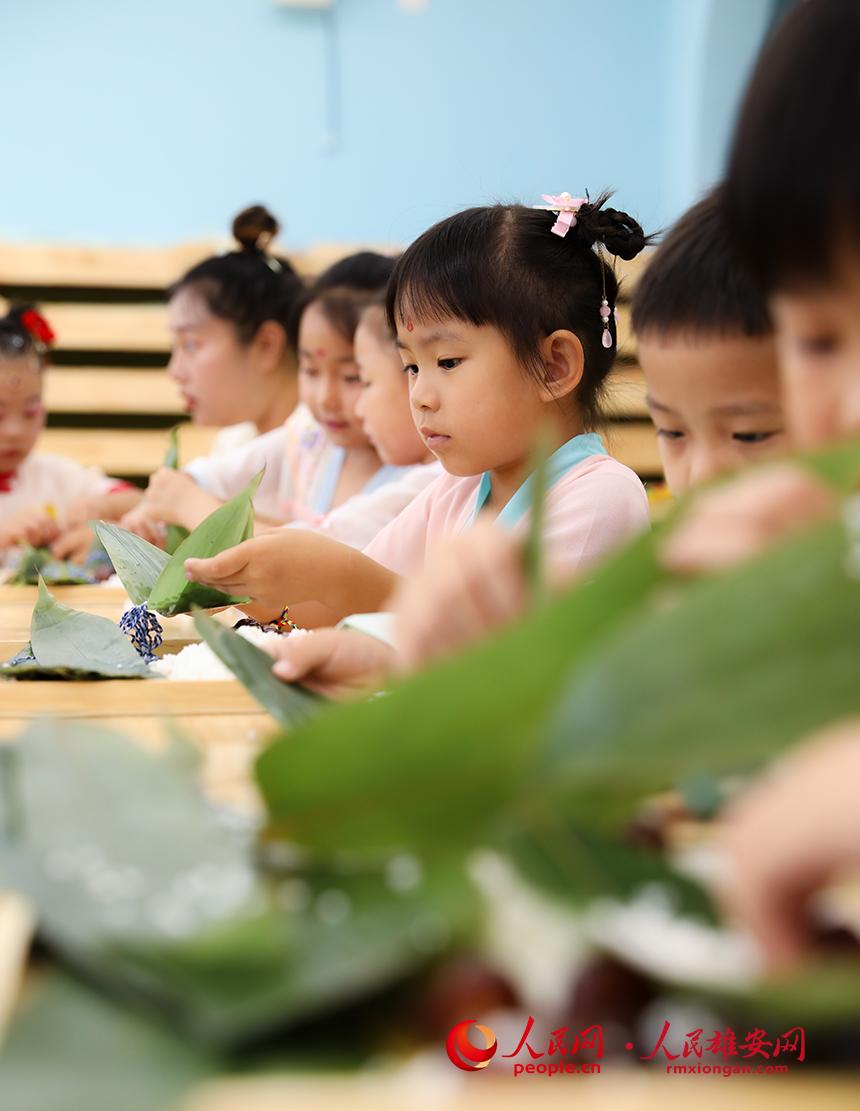 雄安容西青禾幼兒園開展端午游園會活動,孩子們正在學習包粽子。人民網 任俊潔攝