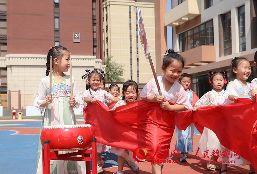 雄安容西青禾幼兒園的孩子們正在進行“賽龍舟”游戲。人民網 李兆民攝