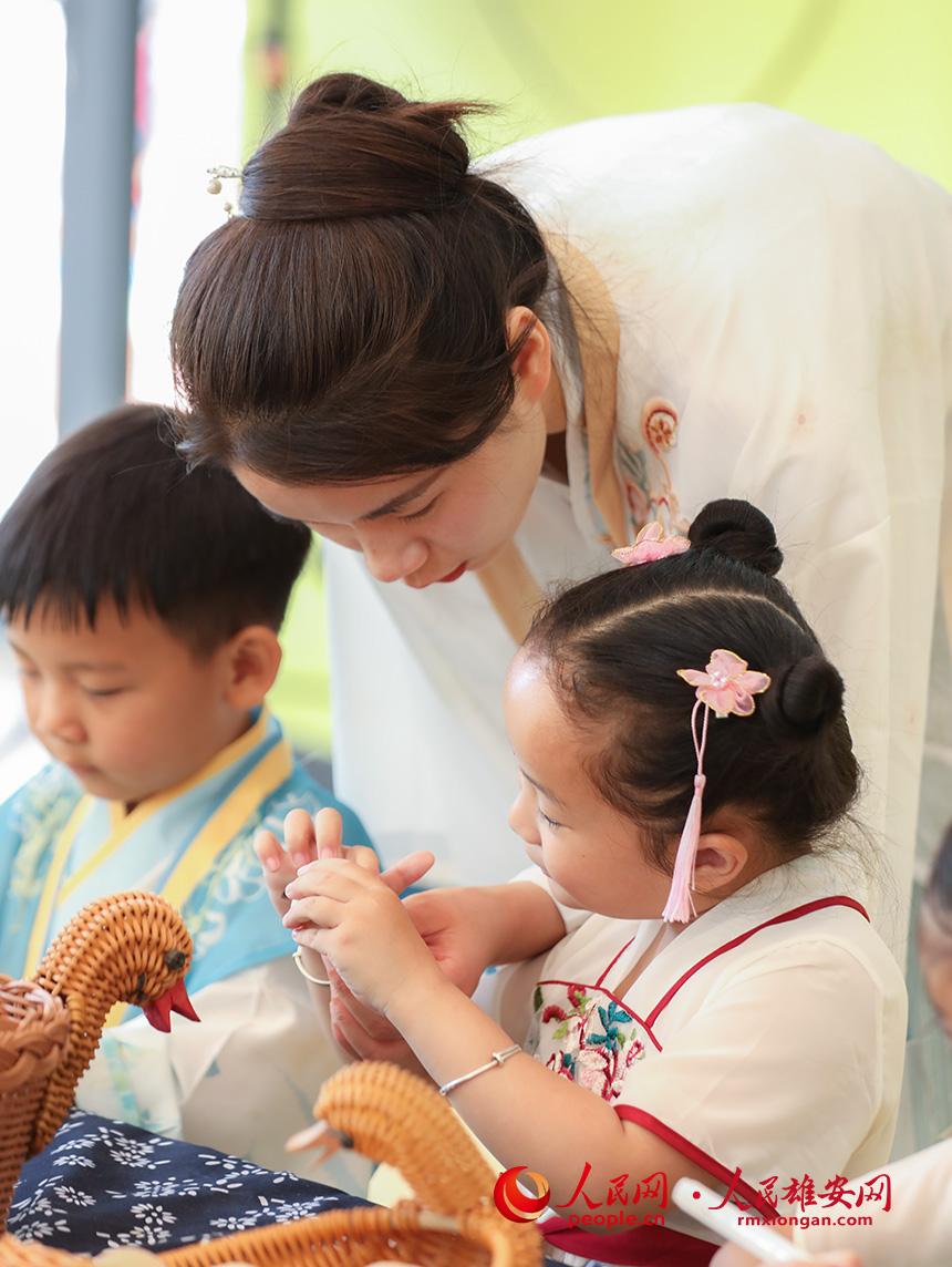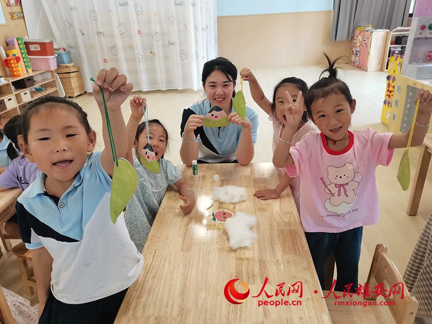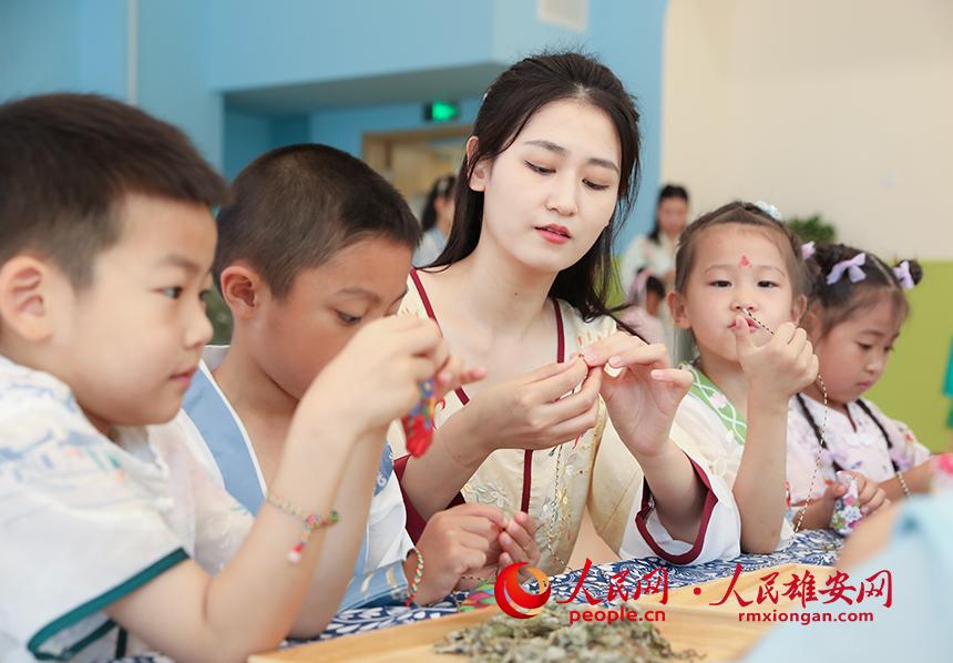 雄安容西青禾幼兒園端午游園會活動上,老師正在教孩子們包香囊。人民網 李兆民攝