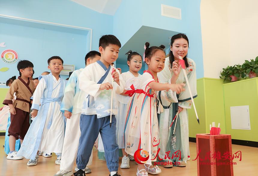 雄安容西青禾幼兒園端午游園會活動上,孩子們正在投壺。人民網 李兆民攝