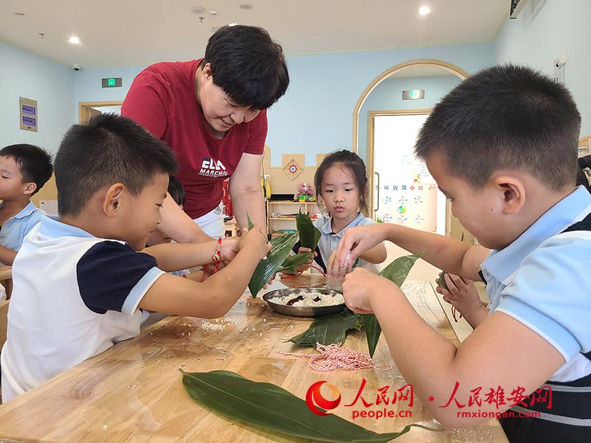 雄安容西興學幼兒園的老師正在教孩子們包粽子。興學幼兒園供圖